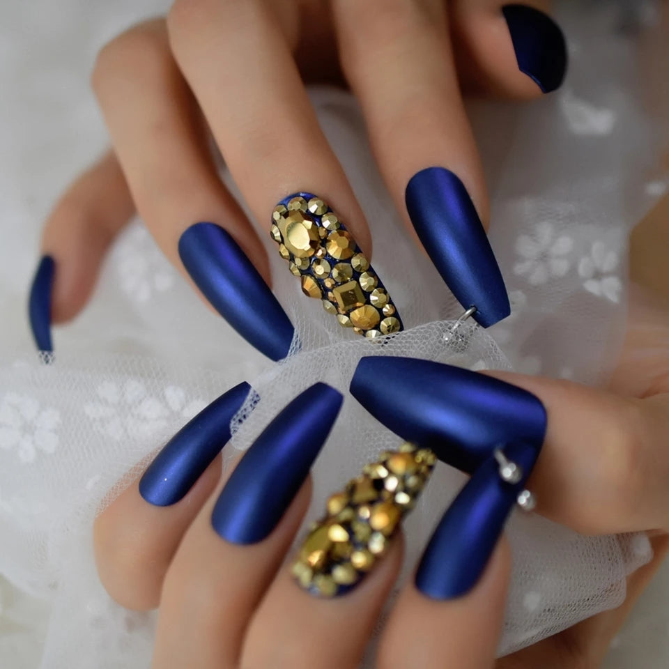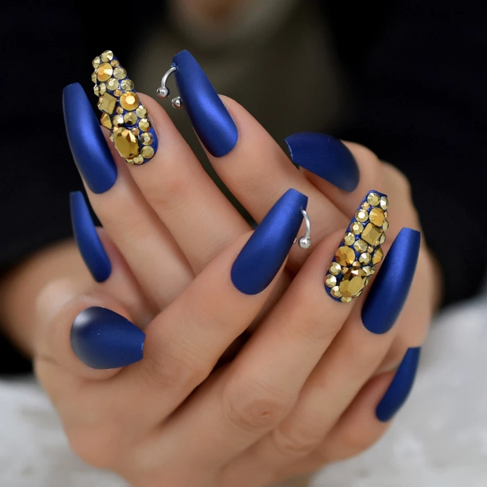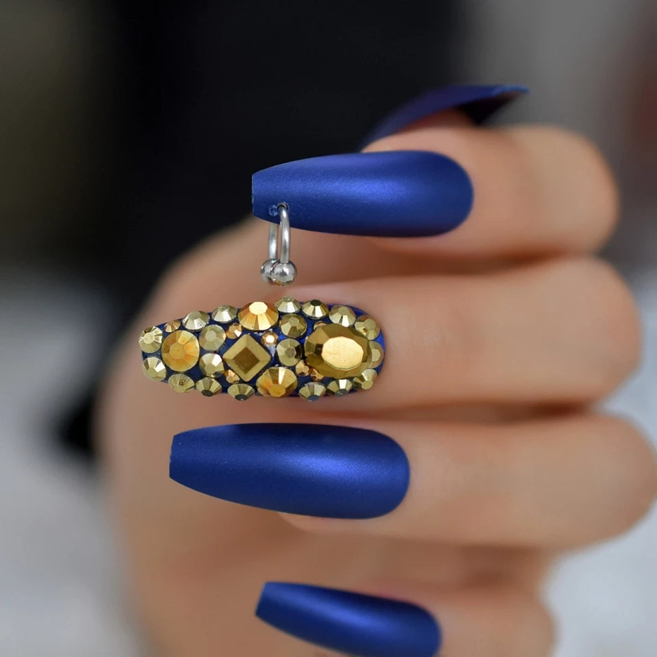 Vanessa features a beautiful royal blue matte finish and gold encrusted stone/pierced accents!