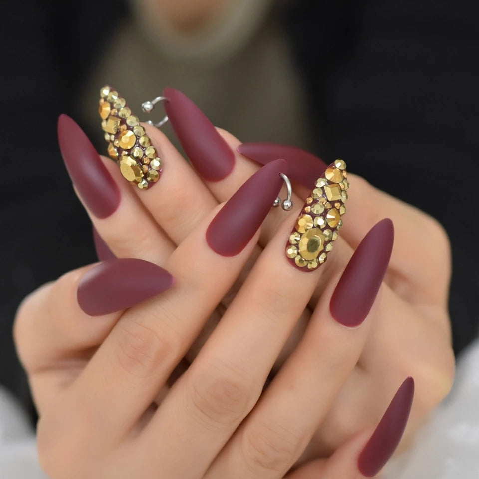 Angela features a beautiful maroon matte finish with beautiful stones and piercings!